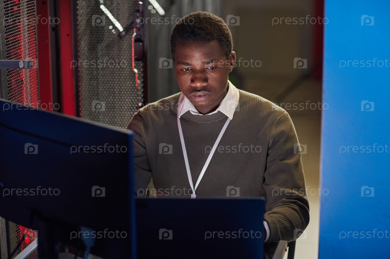 Фокусированный техник, работающий в серверах мониторинга центра обработки данных