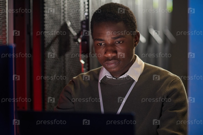 Концентрируясь на экране компьютера в серверной комнате
