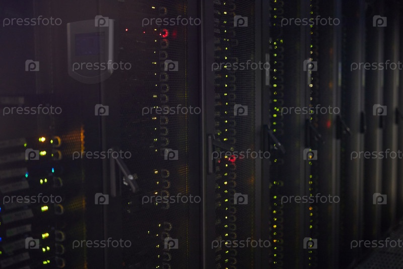 Ряд серверов в центре обработки данных с светодиодными огнями
