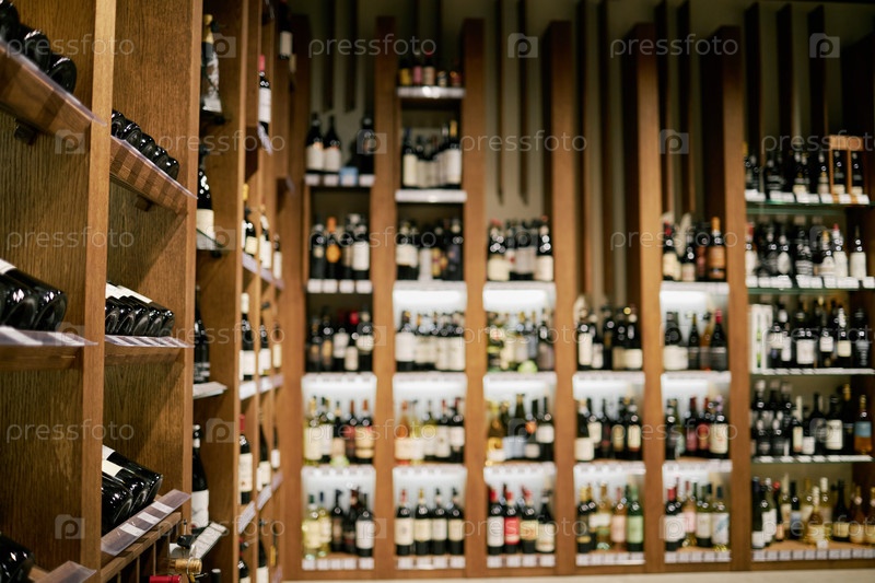 Ряд бутылочных вин на деревянных полках в магазине