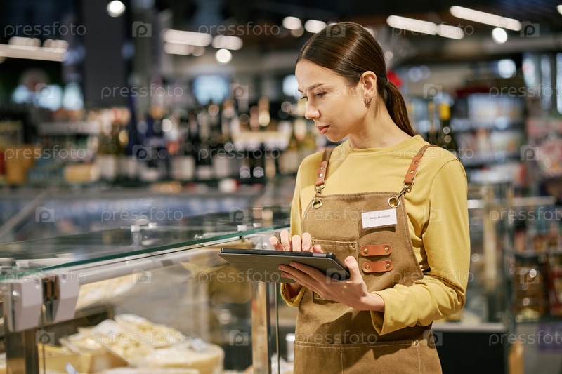 Женщина проверяет инвентарь в продуктовом магазине с помощью планшета