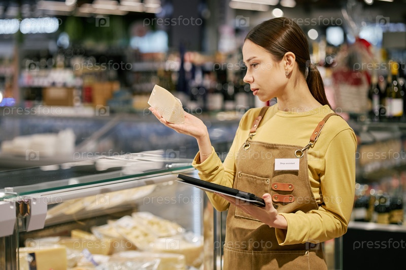 Молодая женщина оценивает сыр в проходе супермаркета