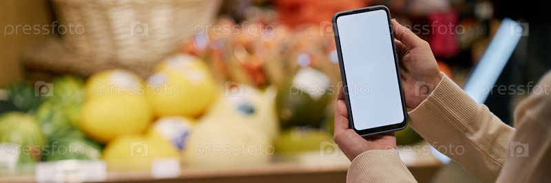Заголовок изображения женщины, держащей смартфон с пустым экраном