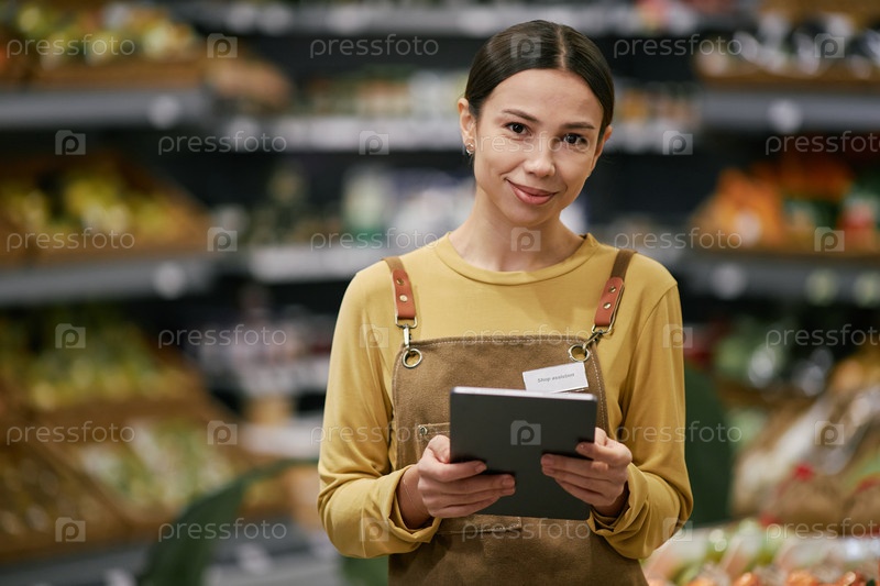 Портрет улыбающейся женщины, держащей планшет в магазине