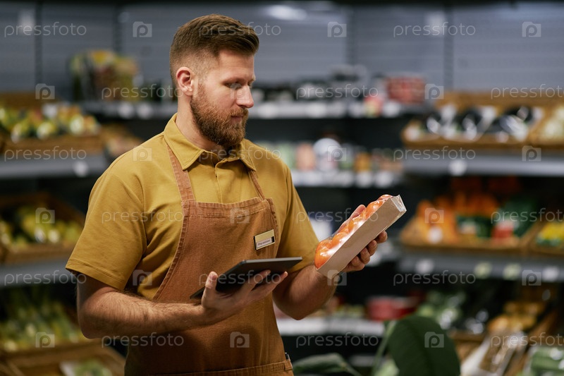 Бородатый мужской продавец продуктов питания, держащий цифровой планшет