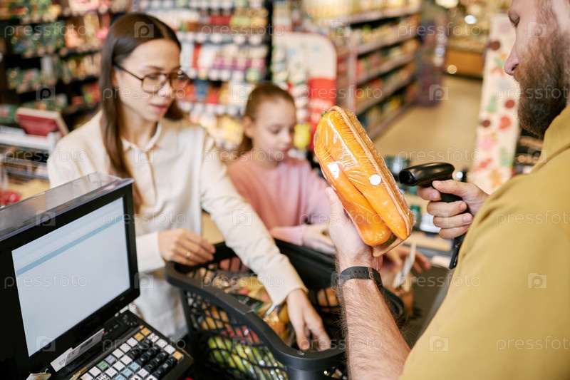 Сканирование продуктов питания на кассе в супермаркете
