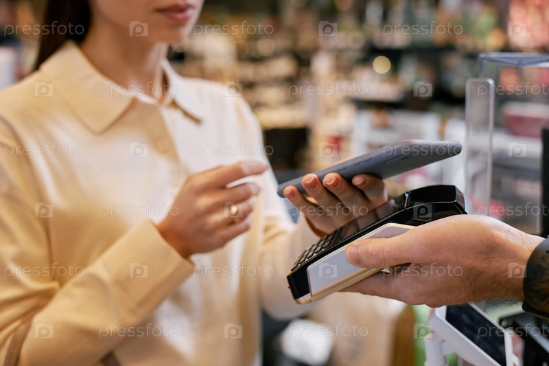 Женщина, использующая телефон для цифровых платежей на прилавке магазина