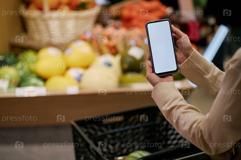 Покупки со смартфоном в продуктовом магазине Фон