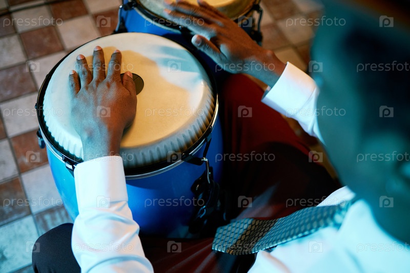 Черный мужчина играет на барабанах конги во время живого шоу в джазовом клубе под голубым светом