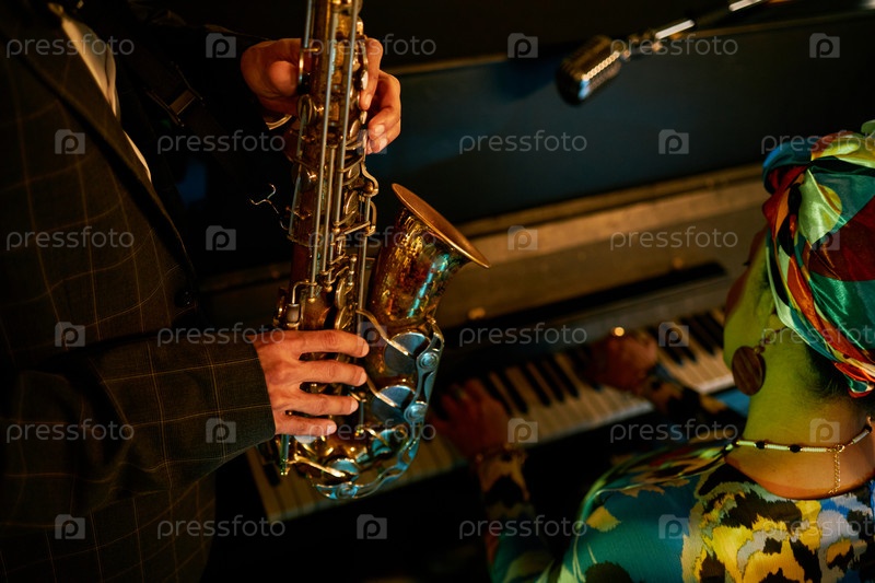 Саксофонист играет музыку, сопровождая пианино в джазовом клубе