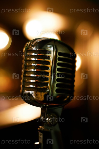 Ретро-микрофон, стоящий против туманных огней в джазовом клубе