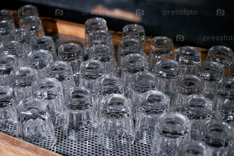 Пустые чистые бокалы помещены вверх ногами на сушильной полке в баре