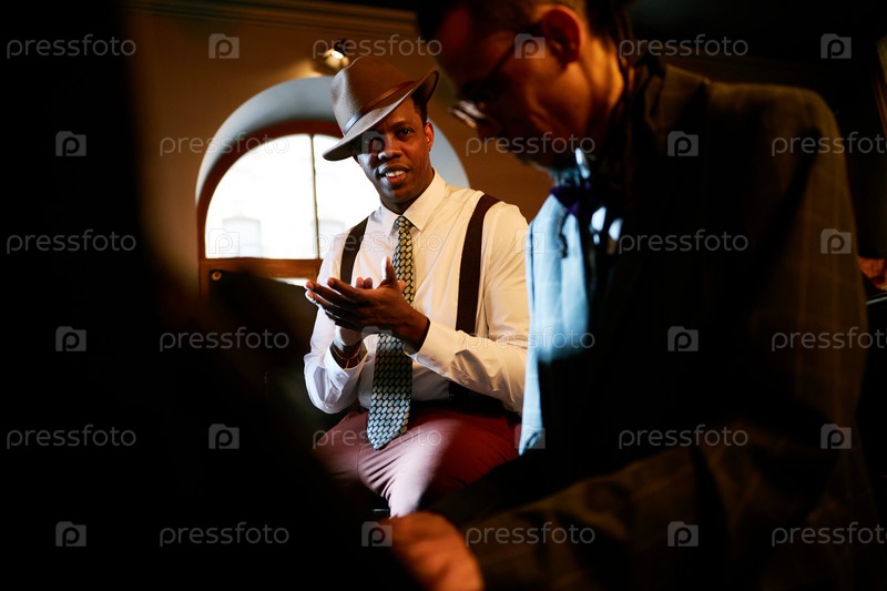 Улыбающийся чернокожий мужчина в шляпе аплодирует пианистам Выступление в джазовом клубе