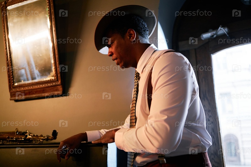 Музыкант-чернокожий мужчина, носящий старинную шляпу, стоит возле фортепиано в джазовом клубе