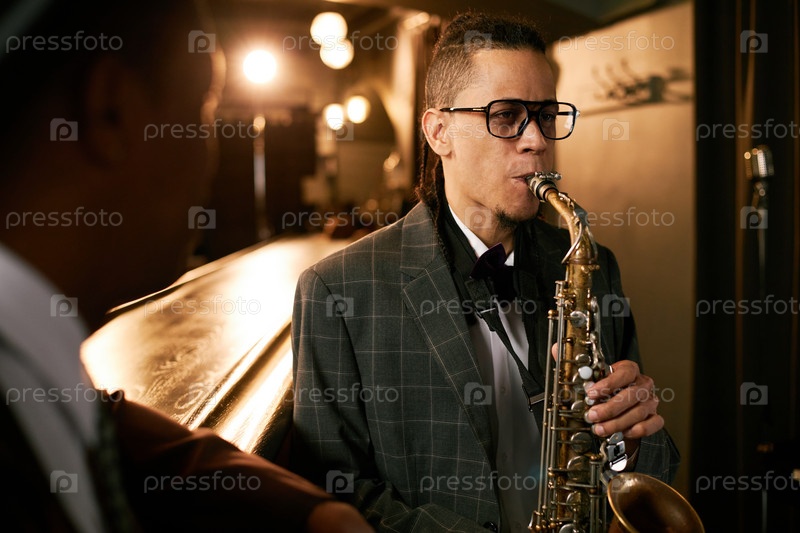 Мультиэтнический мужской саксофонист играет музыку в дымно освещенном джазовом клубе
