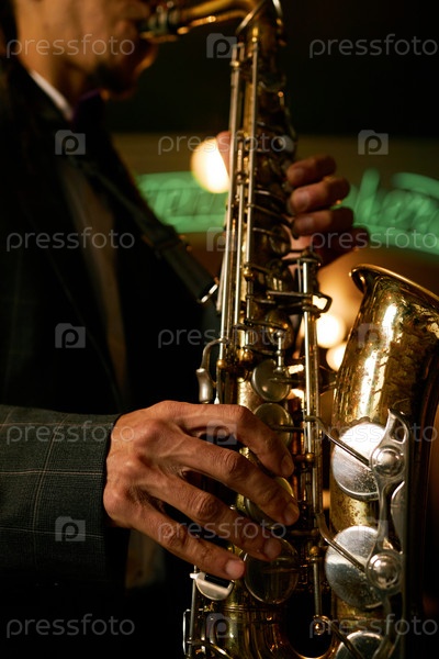 Музыканты нажимают пальцами на клавиши саксофона, играя музыку в джазовом клубе