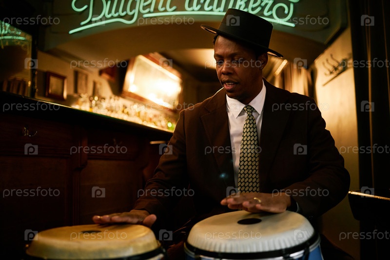 Чернокожий мужчина в шляпе играет на конгасах, исполняет живый джаз в баре Dimly Lit