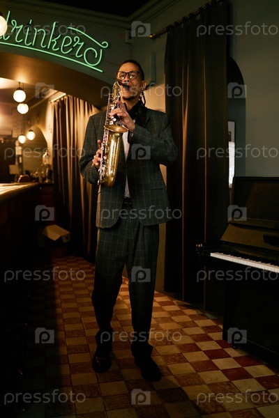 Саксофонист в костюме, играющий живую музыку в джазовом клубе