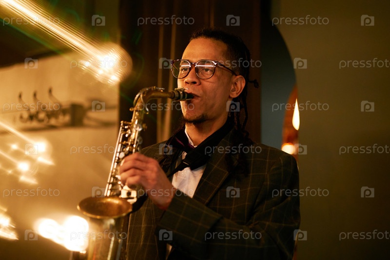 Музыкант с очками играет на саксофоне во время живого мероприятия в джазовом клубе