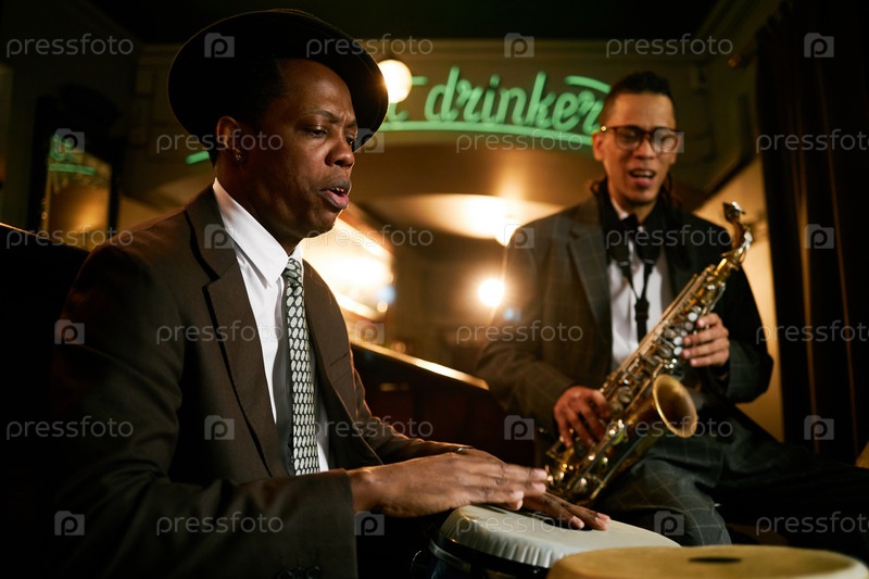 Черный мужской барабанщик выступает с группой в джазовом клубе играя на конга