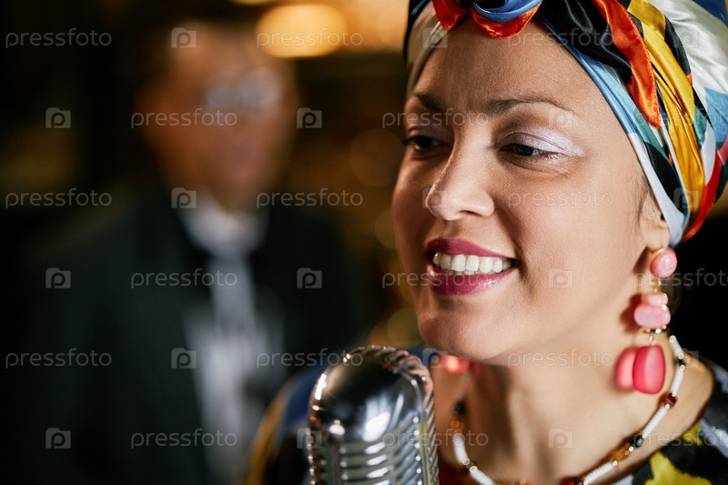 Улыбающаяся мультиэтническая женщина в головном уборе поет с группой в джазовом клубе Indoors