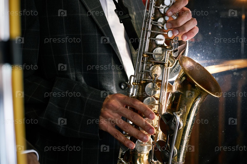 Саксофонист играет музыку, нажимая клавиши приборов во время живых событий в помещении