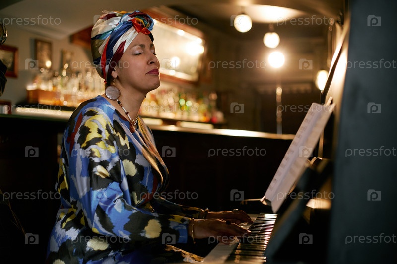 Женщина-артистка в головном уборе играет на пианино, исполняя джазовую музыку в баре