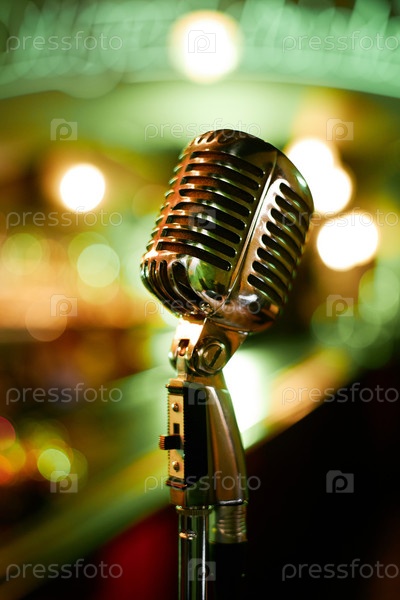 Старый модный хромовый микрофон, стоящий на зеленых неоновых огнях в джазовом клубе