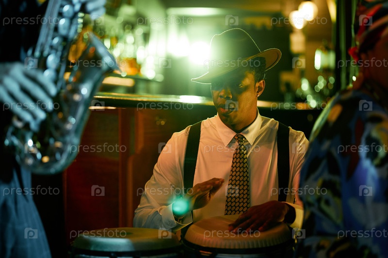 Чёрный барабанщик играет на конгасе с джазовой группой в баре под неоновыми огнями