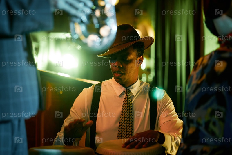 Черный мужской перкуссионист играет на конга с джазовой группой в баре под неоновыми огнями