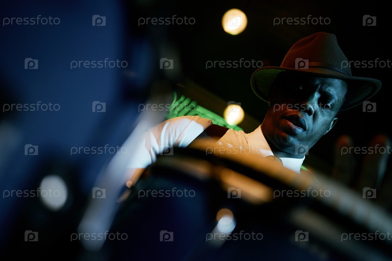 Музыкант-чернокожий мужчина играет на барабанах в баре под синим светом