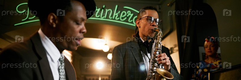Header Image of Музыкант-мужчина играет на саксофоне с джазовой группой в баре