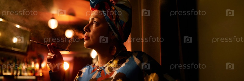 Header Image of Multiethnic Woman in Headwrap Курение сигарет в баре