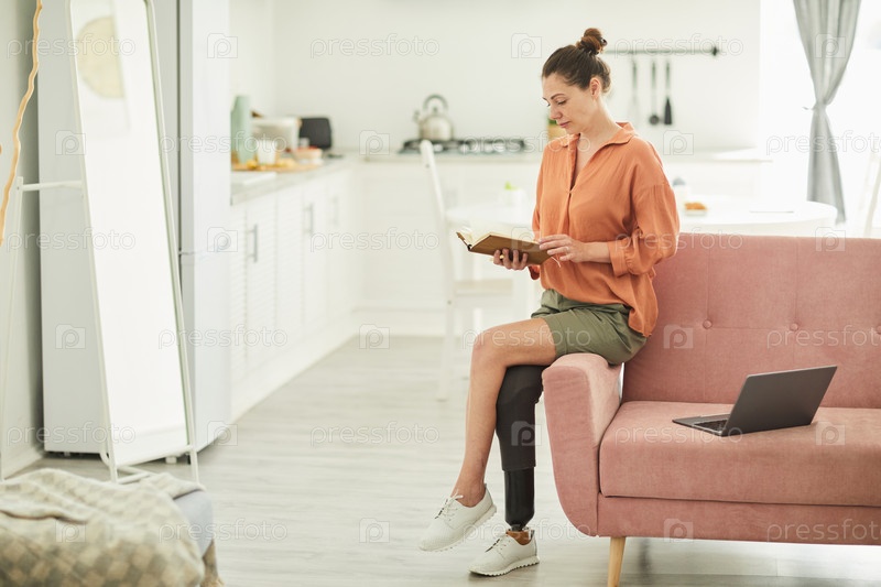 Женщина с протезированной ногой расслабляется дома
