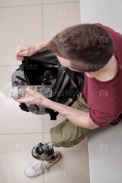 Молодой человек с роботизированной ногой кладет бутылку воды в сумку