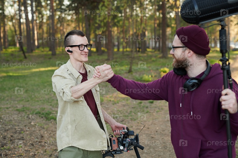 Молодой оператор и его ассистент с микрофоном пожали друг другу руки