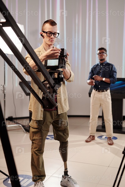 Оператор с роботизированной ногой снимает видео, на фоне которого африканский мужчина