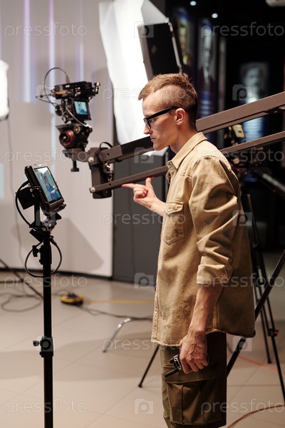 Молодой оператор смотрит на дисплей во время съемки видео