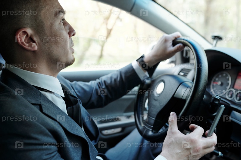 Молодой бизнесмен, держащийся за руль во время поездки домой