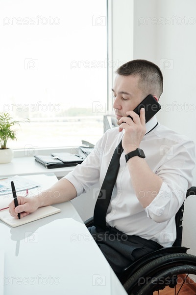Успешный бизнесмен разговаривает со своим смартфоном и делает заметки