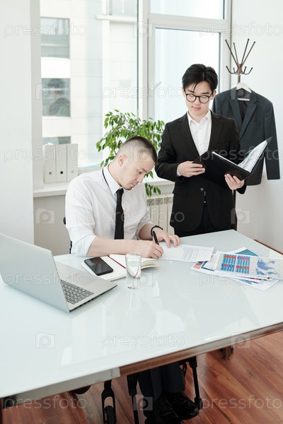 Босс подписывает документы, в то время как азиатский мужчина стоит рядом с его столом