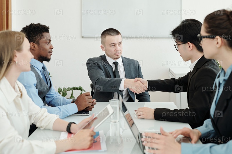 Инвалидный бизнесмен приветствует иностранного партнера рукопожатием