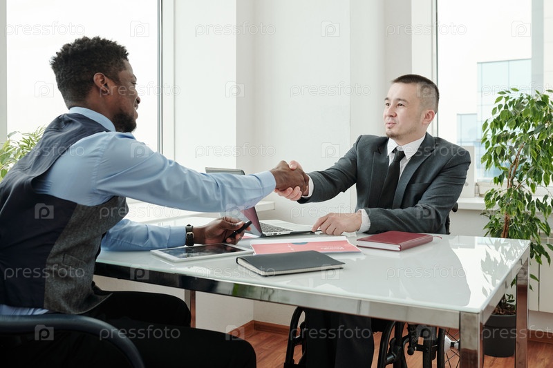 Молодой элегантный бизнесмен, пожавший руку коллеге африканской этнической принадлежности