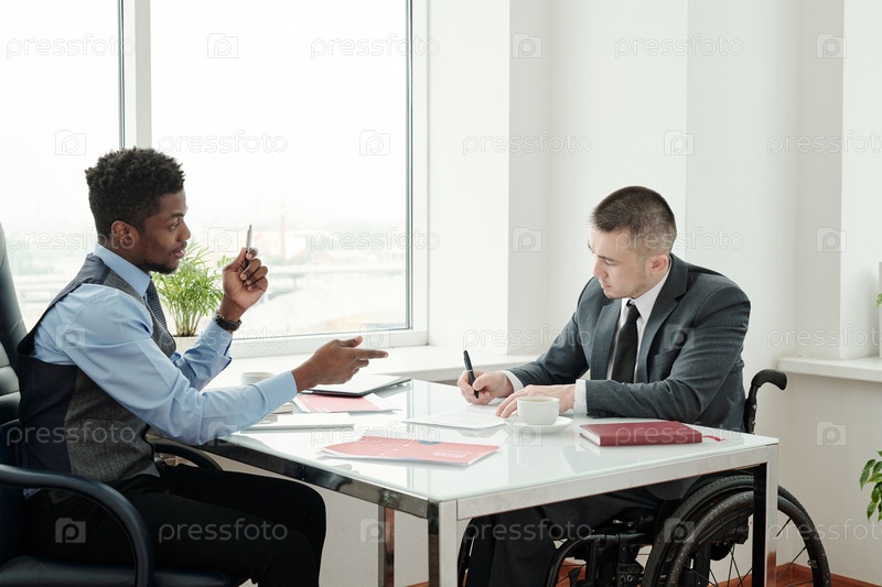 Африканский бизнесмен разговаривает со смешанной расовой инвалидной партнершей, подписывая бумагу