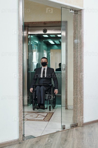 Инвалид в костюме и защитной маске выходит из лифта
