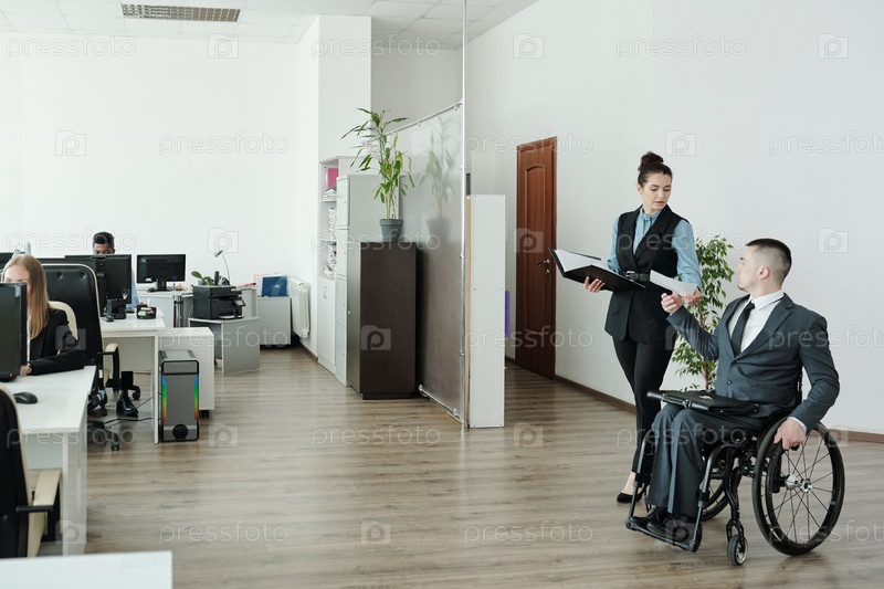 Инвалидный бизнесмен в инвалидной коляске передает бумагу своему секретарю