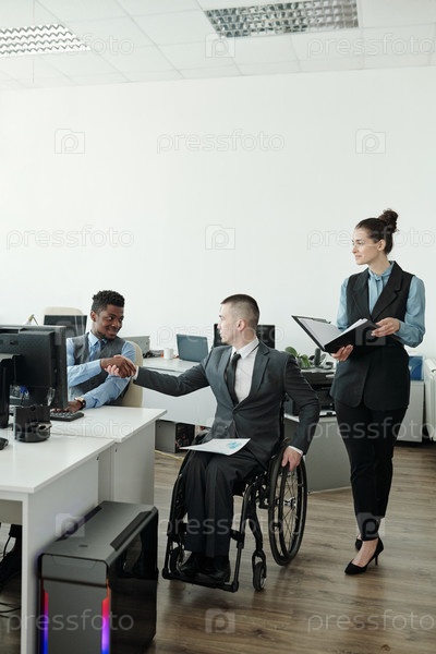 Успешный бизнесмен в инвалидном кресле приветствует своего африканского коллегу