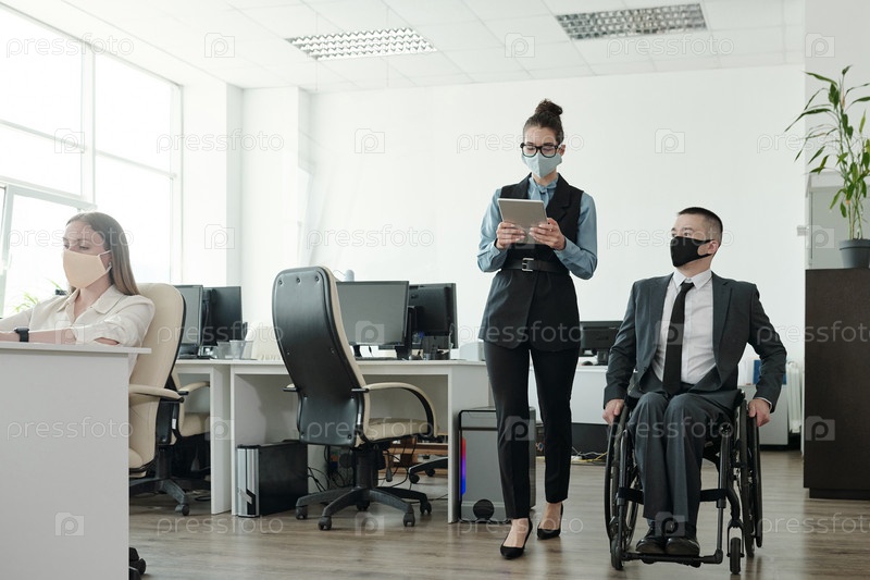 Молодой бизнесмен и деловая женщина в масках и формальной одежде взаимодействуют в офисе