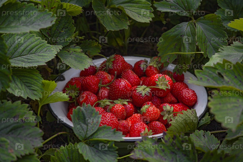 Летний натюрморт, тарелка спелых садовых клубники сделанная в ближайшем плане