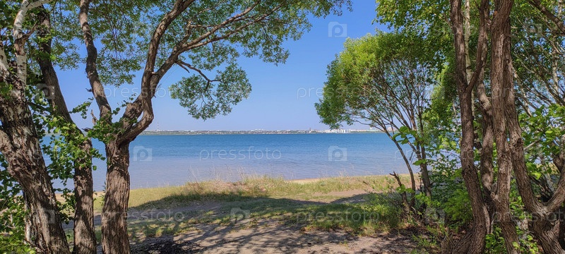 Пляж и зеленые деревья в солнечный летний день